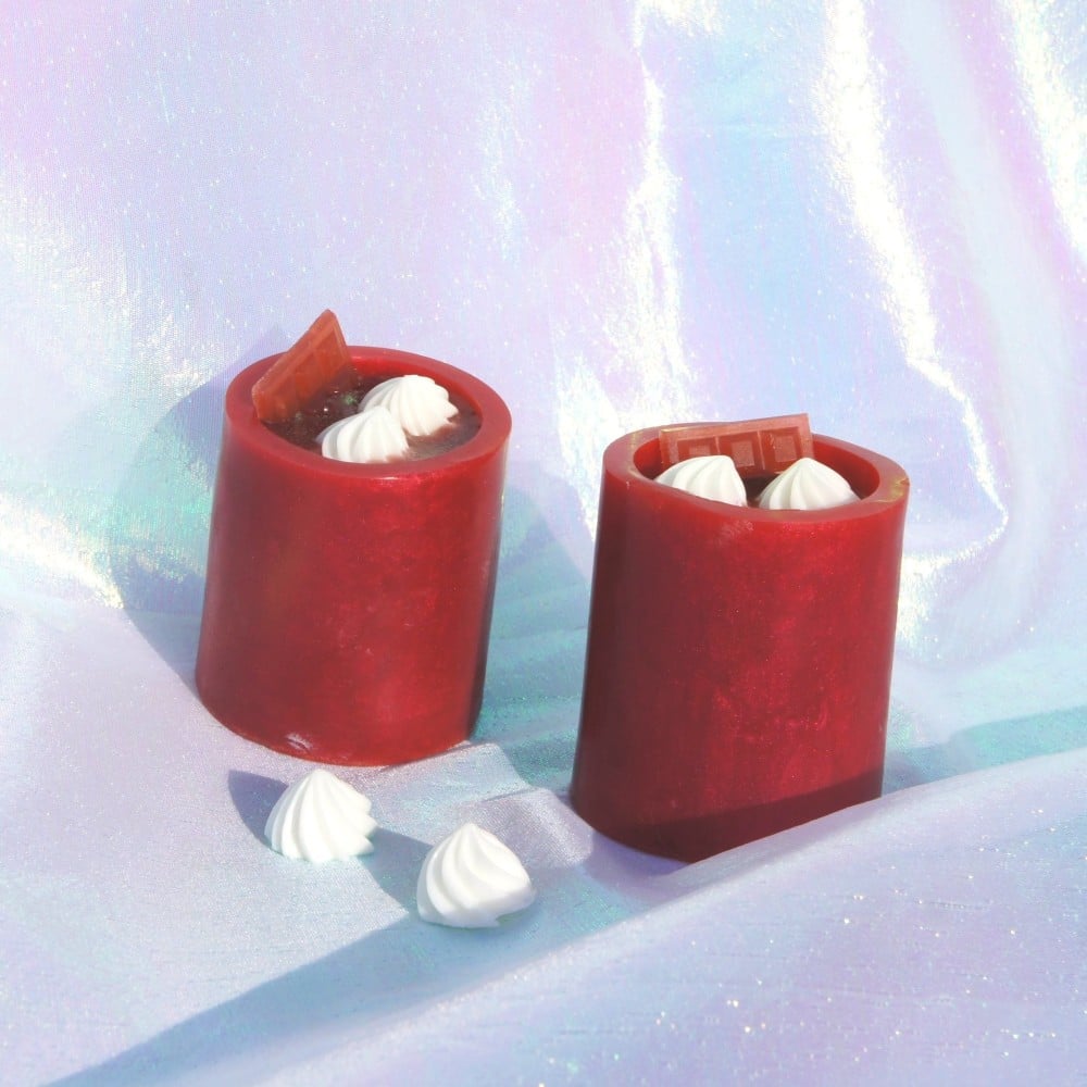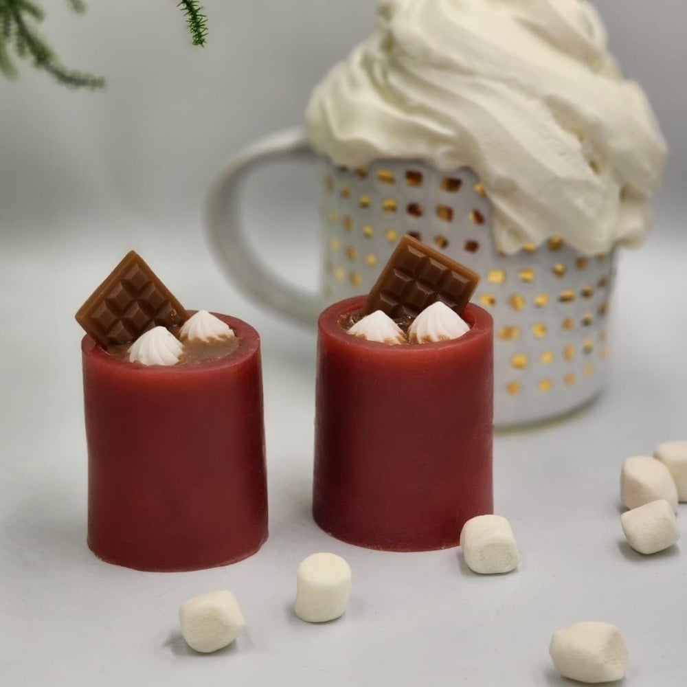 صابون جلسرين على شكل مشروب الشوكولاته الساخنة مزين بقطع الكريمة والكاكاو المصنوعة من الصابون